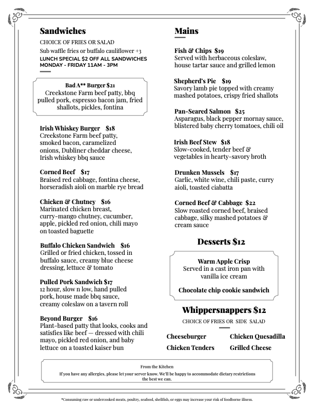 Creekstone Farm beef pattym, smoked bacon, caramelized onions, Dubliner cheddar cheese, Irish whiskey BBQ sauce